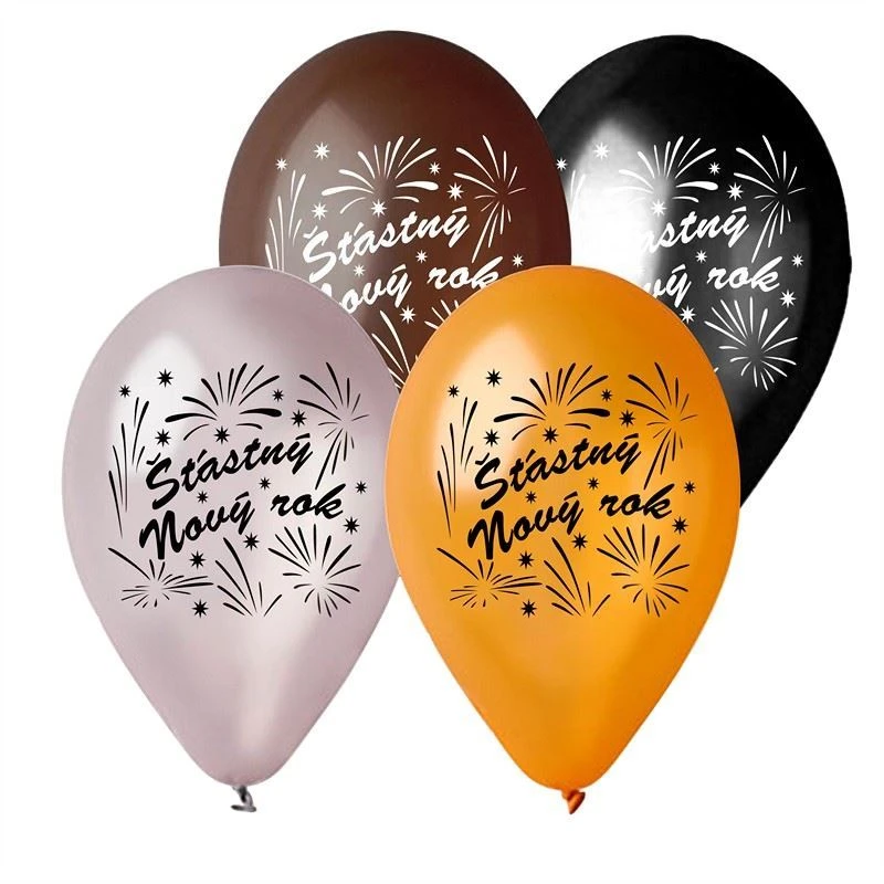 Metalický balónek ve zlaté, stříbrné, černé a hnědé barvě s potiskem Šťastný Nový rok podél celého obvodu.