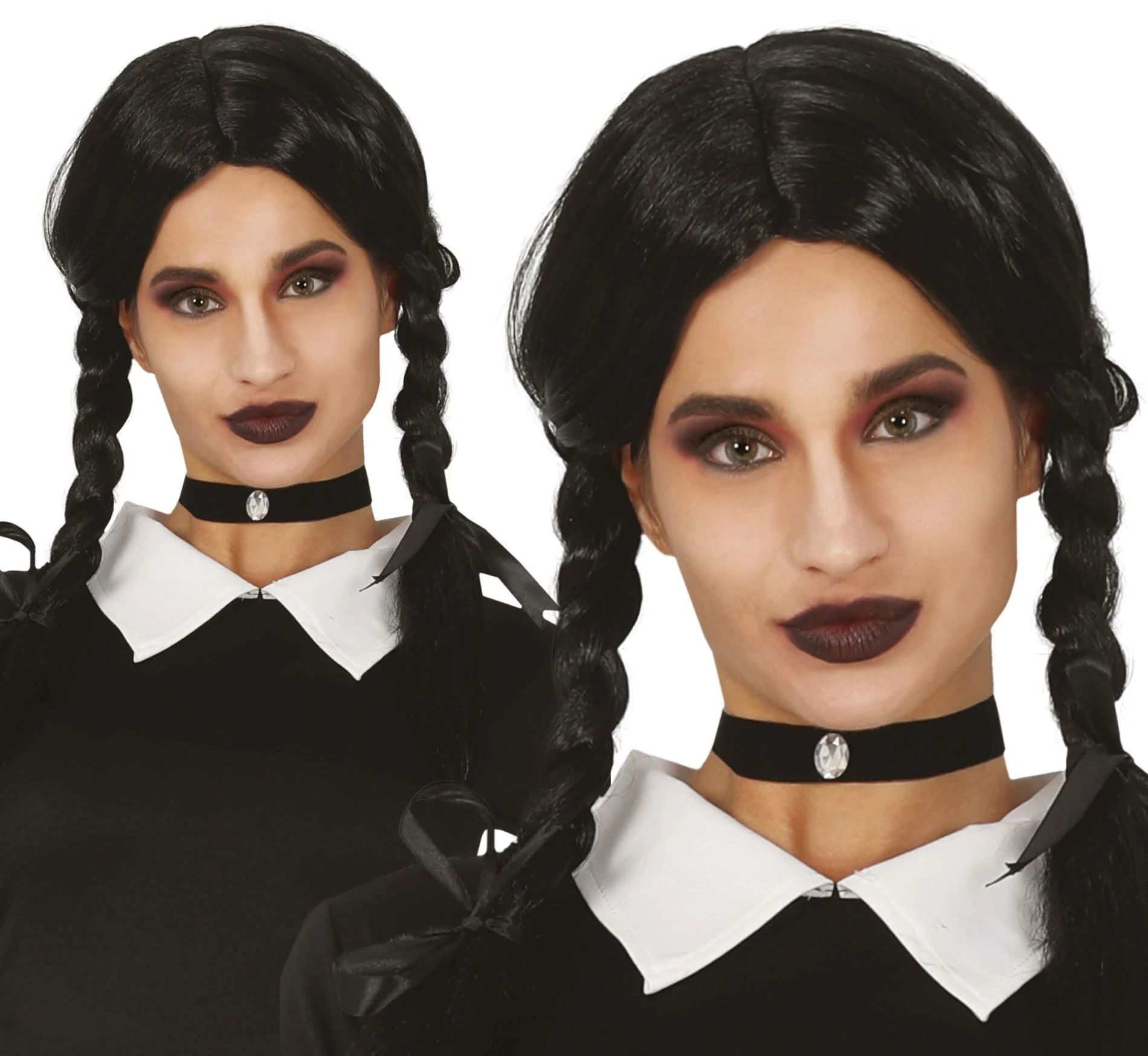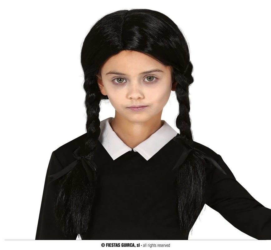Krásná paruka černá s copy ve podobném stylu postavy Wednesday, která doplní Váš karnevalový kostým!