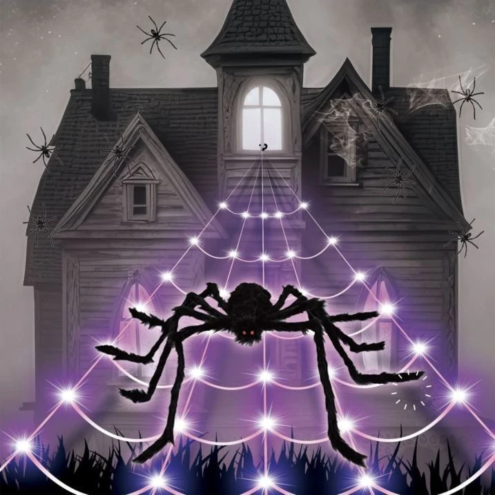 Tato strašidelná dekorace v podobě obřího černého pavouka s rudýma očima je ideálním doplňkem na zahradu, fasádu nebo vstupní prostor. Pavouk je doplněn o zářivou pavučinu s LED efektem, která vytváří neodolatelnou noční atmosféru.