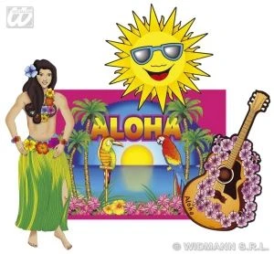 Sada papírových dekorací 50 cm velkých. Dekorační Hawai set obsahuje: papírové slunce, havajskou ženu, zátiší a kytaru. Tento havajský set poslouží jako dekorace na havajské večírky nebo letní párty.