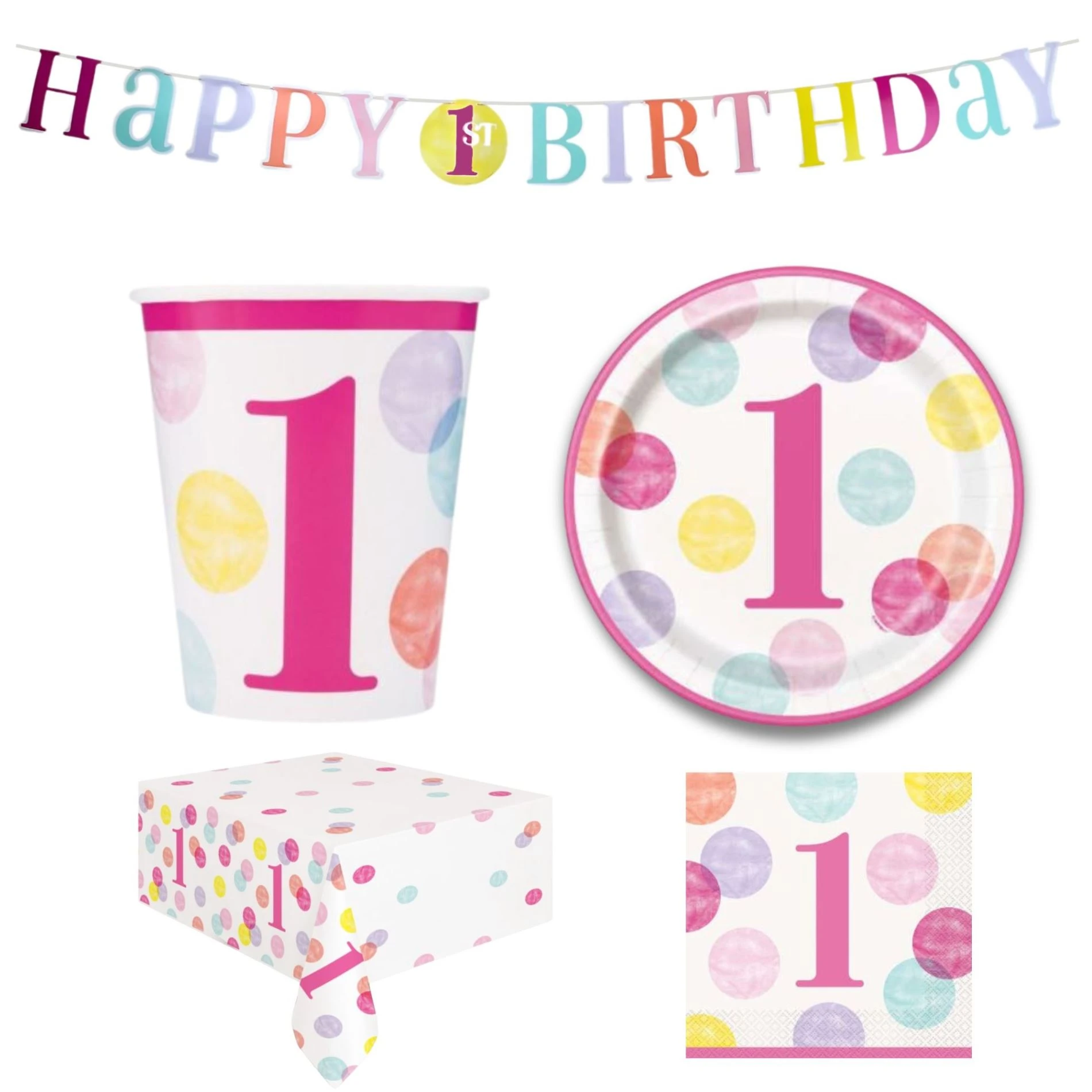 Krásná sada s motivem prvních narozenin holčičky, barevně sladěná a perfektně navržená pro dokonalou oslavu.