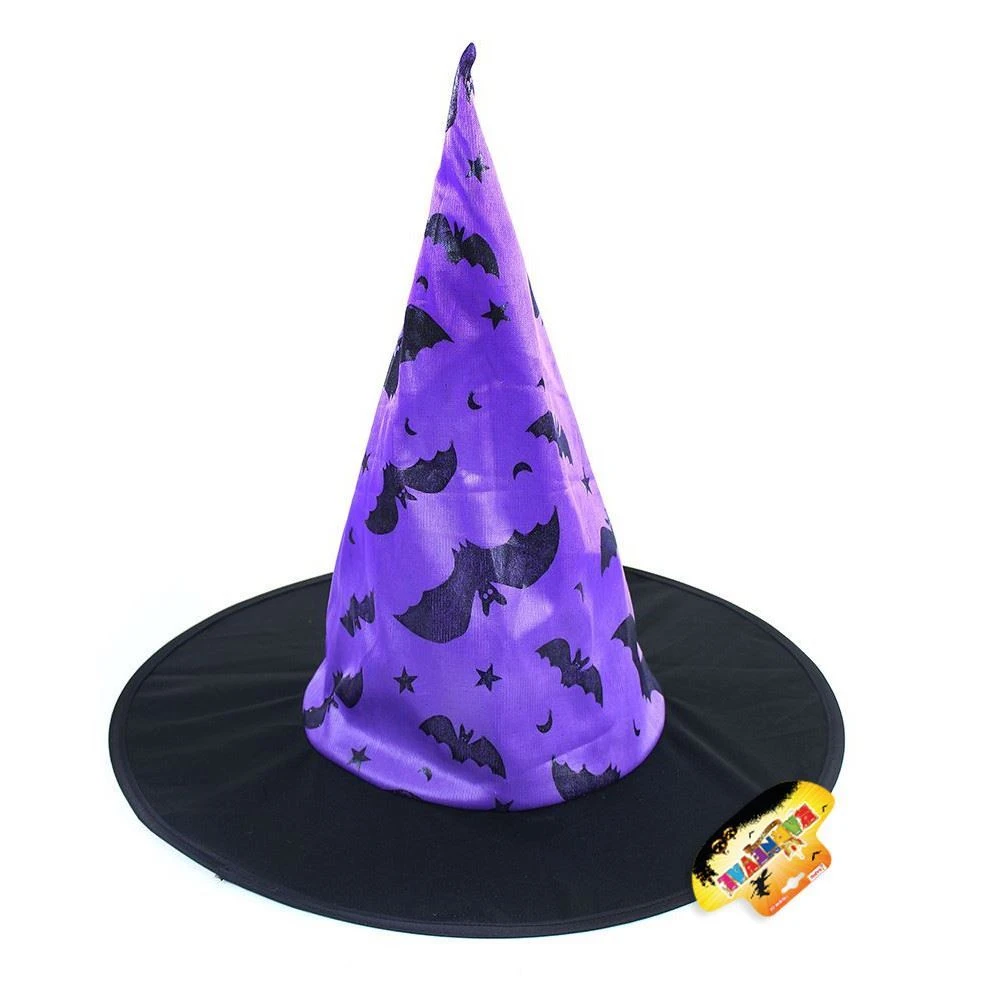 Úžasný čarodějnický klobouk s potiskem ve tvaru netopýrů.