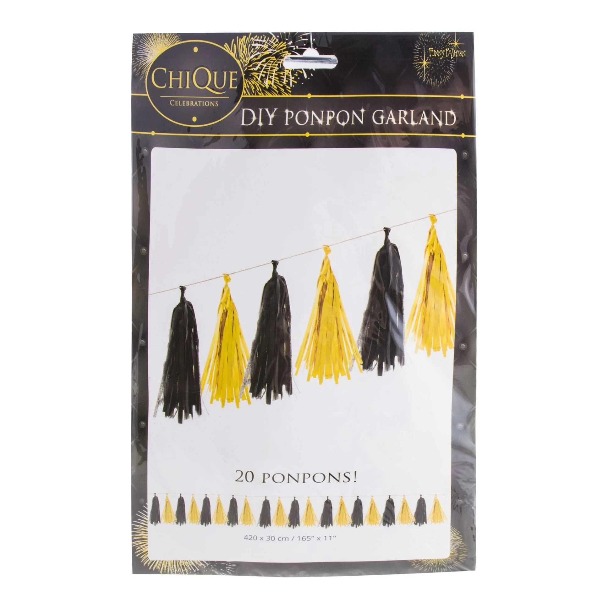 Dotaz k produktu - Girlanda střapce - třásně - pom pom - černo zlatá - 20 ks - 420 x 30 cm - Silvestr