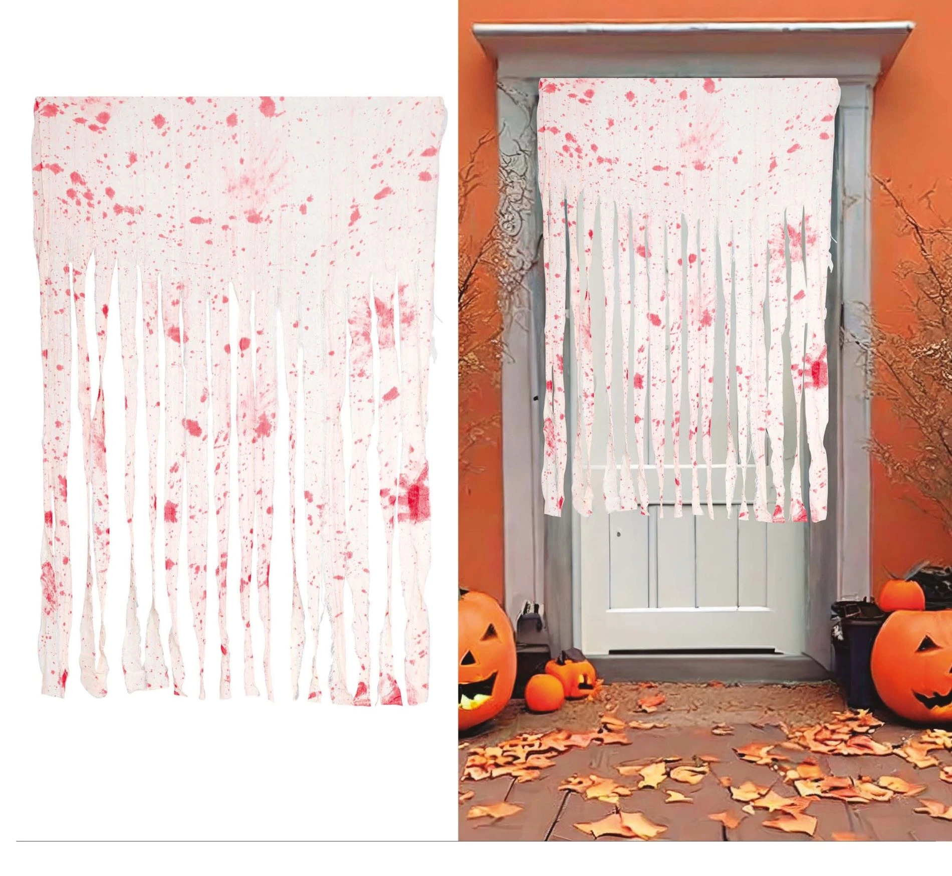 Dveřní krvavý závěs je originální způsob, jak na Halloweenské párty přivítat své hosty. Ihned u vstupu e vám podaří vytvořit strašidelný dojem. Velmi vhodná dekorace na halloween v podobě závěsu s krvavými skvrnami.