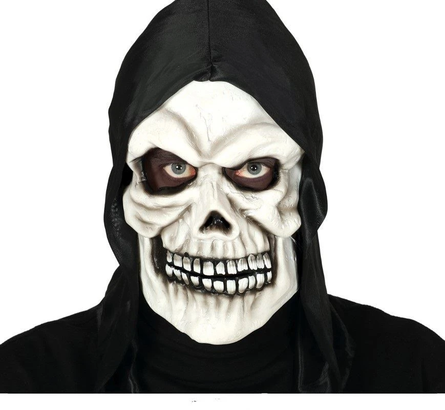 Strašidelná latexová maska kostlivce se skládá z černé kapuce s lebkou. Vhodná volba na halloweenské párty. Kapuce má délku 43 cm.