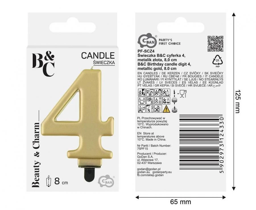 Elegantní zlatá svíčka ve tvaru čísla 8, nesmí chybět na žádném narozeninovém dortu. Svíčka je opatřena plastovým podstavcem, který Vám umožní snadné umístění na dort. Výška svíčky je 8 cm.