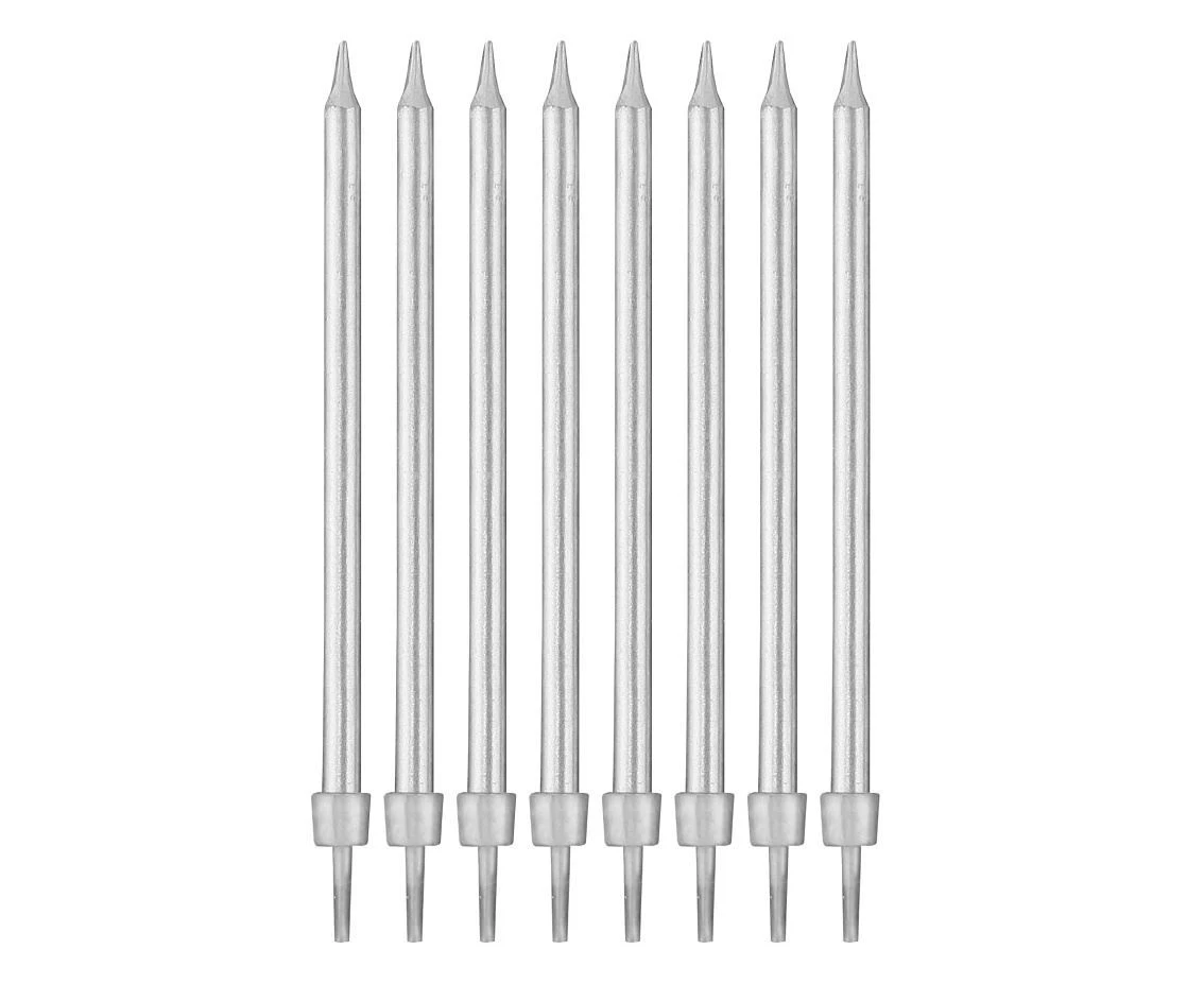 Narozeninové svíčky stříbrné s podstavci – 8 ks, délka 10 cm