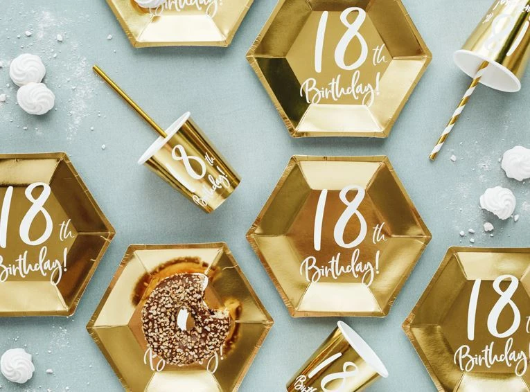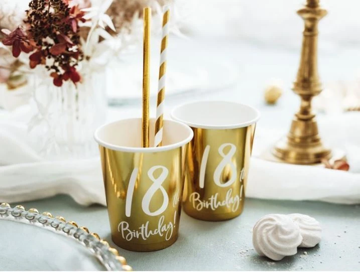 Papírové kelímky ve zlatém lesklém provedení s bílým nápisem „18th Birthday“. Krásný dekorační a praktický doplněk na narozeninovou oslavu.