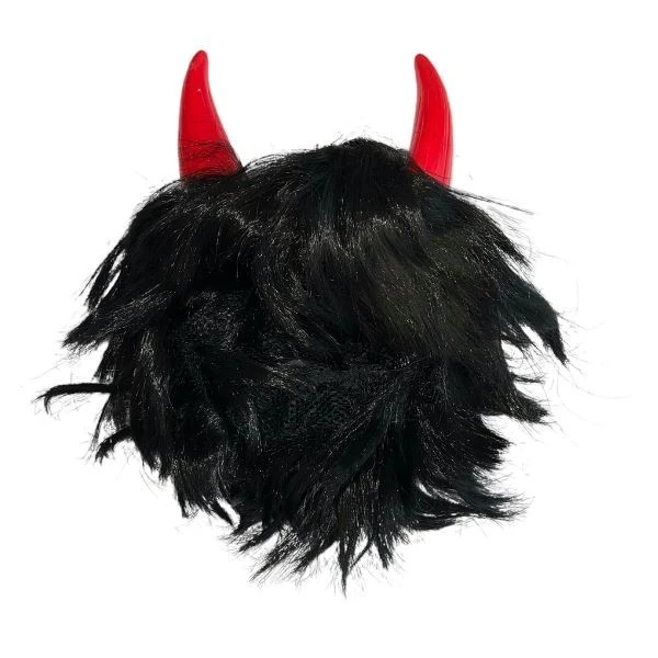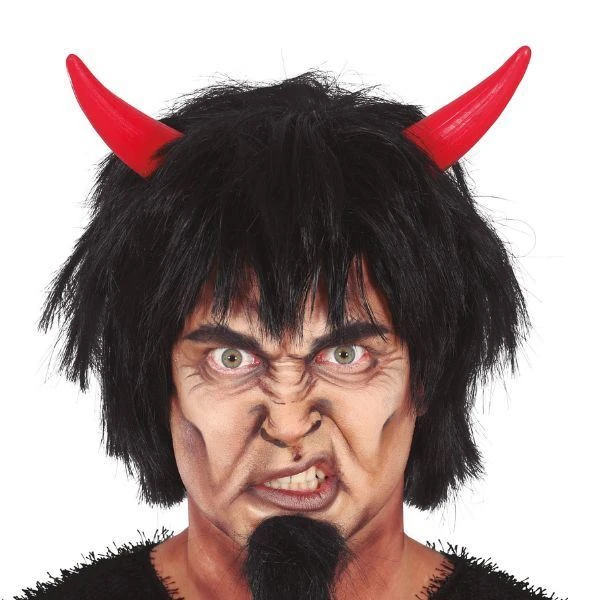 Paruka má krátké černé vlasy s krátkou ofinu a je dekorována červenými rohy.