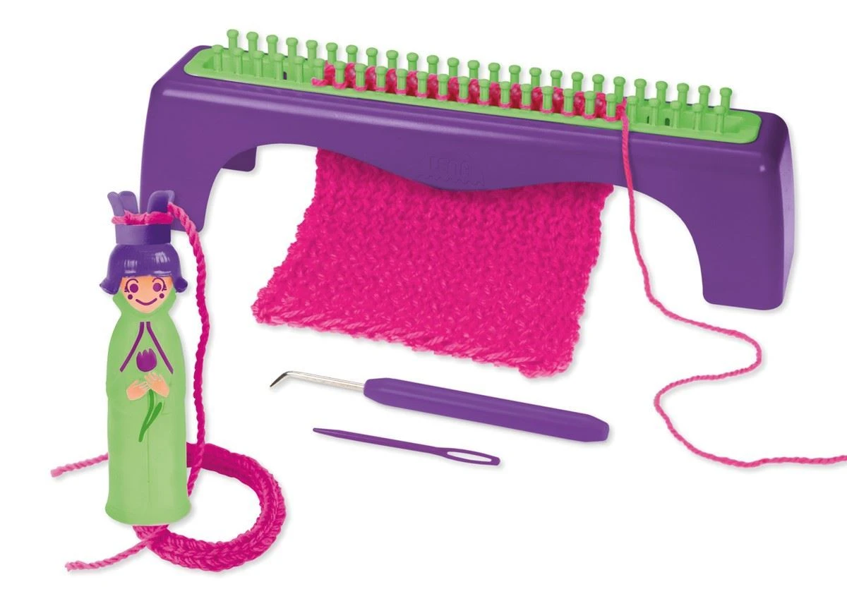 Kompletní sada s pletacím vozíkem, pletací lavicí, pletacími háčky, plastovou jehlicí a barevně sladěnou pletací přízí.