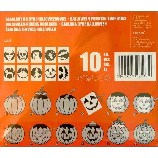 Originální sada 10 ks různých šablon na dýně, s pomocí kterých vytvoříte ty nejstrašidelnější dýně na Vaší Halloween párty.