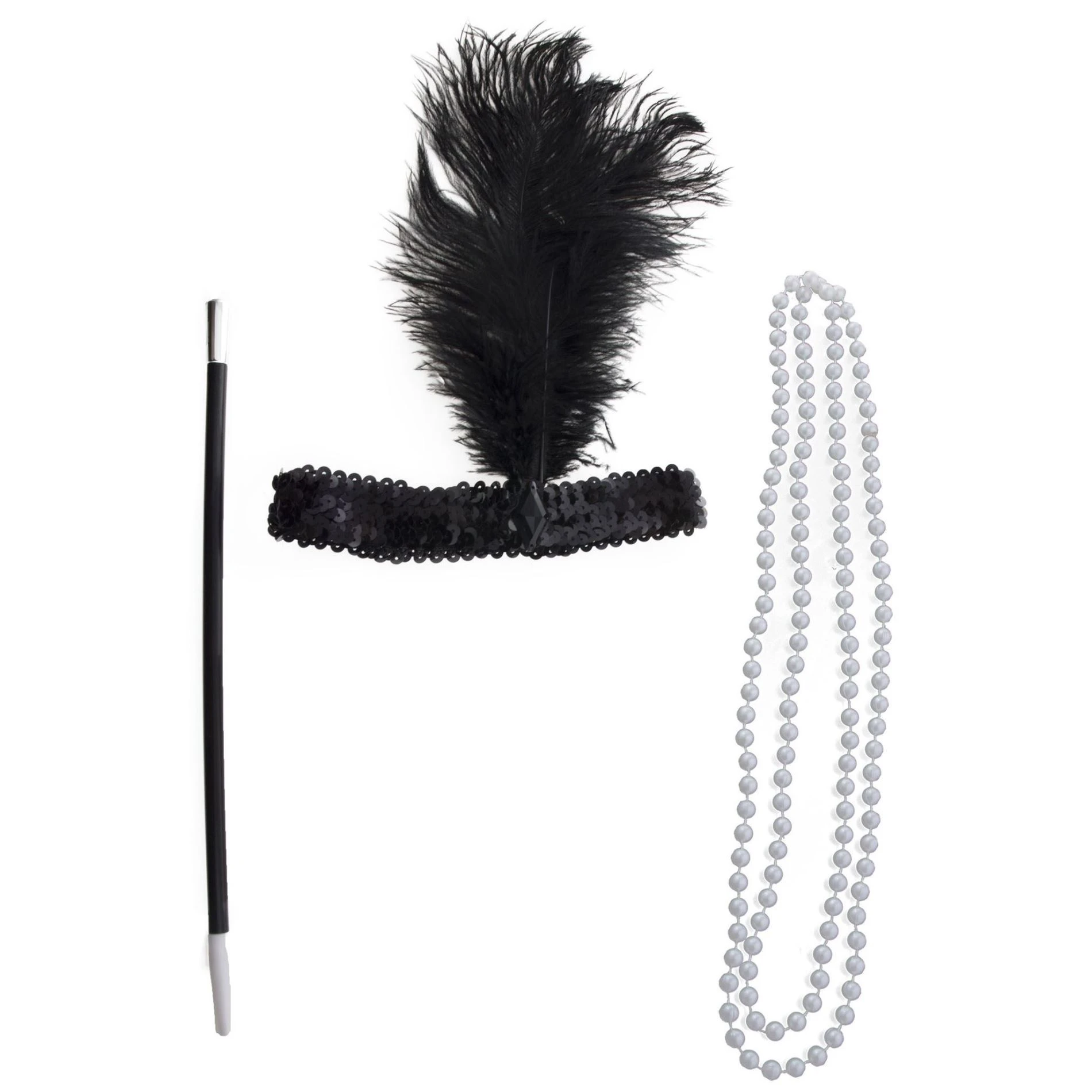Set obsahuje: černou čelenku s peřím, korále a cigaretovou špičku.
