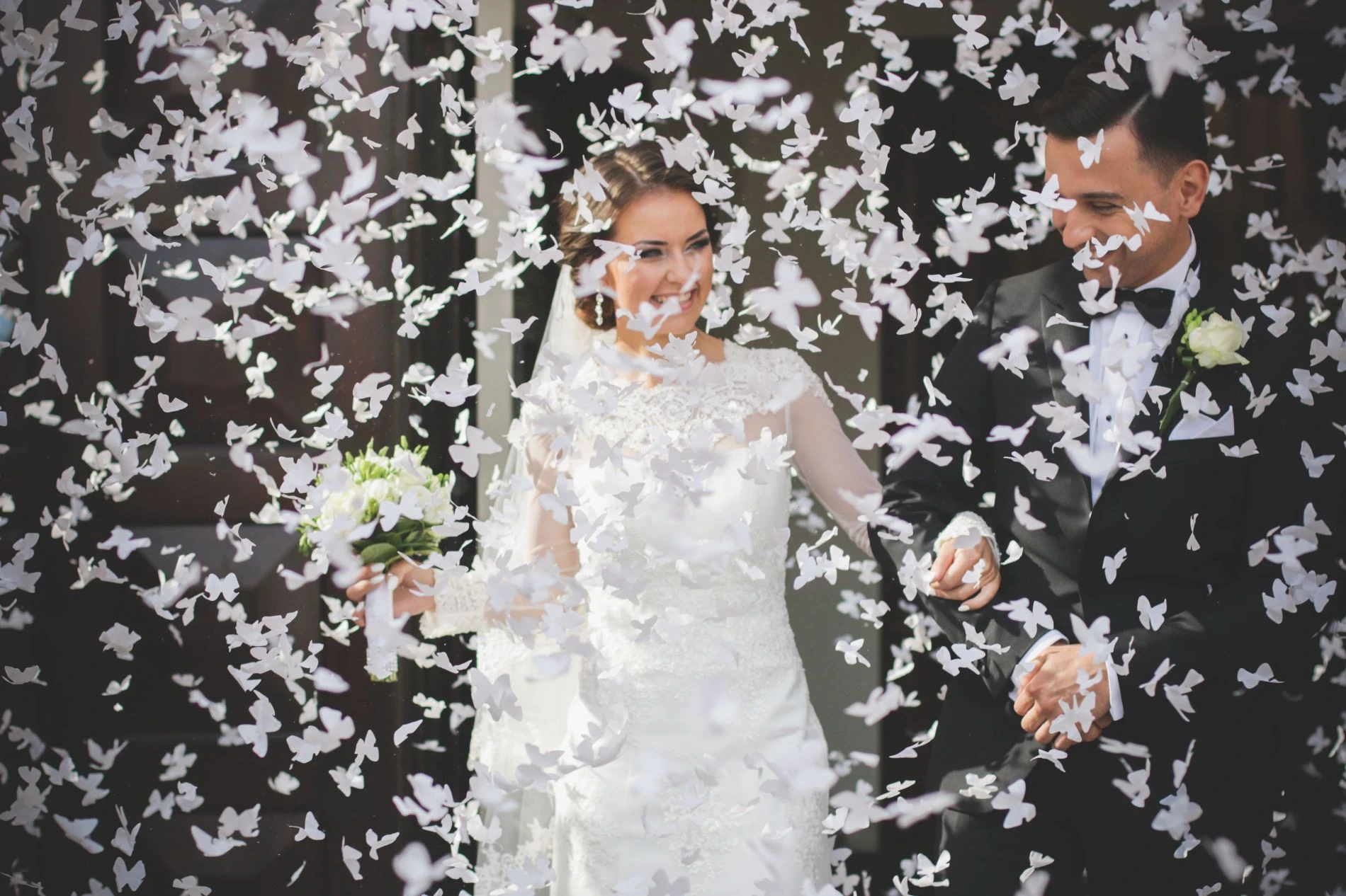 Sada 6 ks svatebních konfet o délce 60 cm s bílými motýlky.