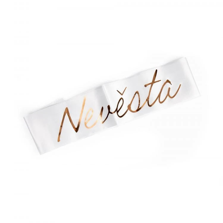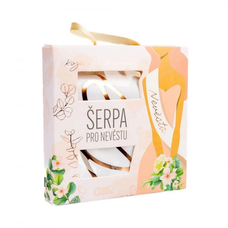 Stylová šerpa se zlato-růžovým nápisem nevěsta nebo černým nápisem ženich nebo je zabalená v krásné krabičce, kterou můžete věnovat jako dárek hned na začátku rozlučky.