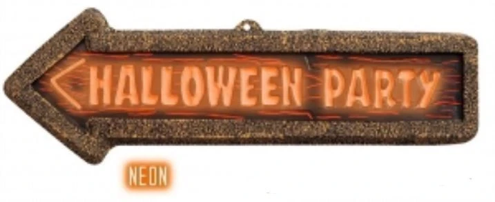 Plastová prostorová šipka ukazující směr k místu konání halloweenové párty. Neonový nápis svítí pod UV zářením. Originální svítící Halloween dekorace upozorňující vaše přátele na nejlepší párty všech dob.