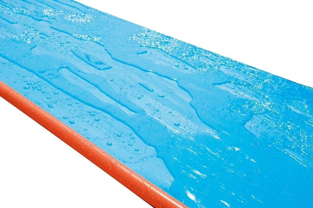 Na bočních stranách skluzavky stříká voda z trysek a jízdu bezpečně ukončí bazének s vodou, která při dojezdu vytvoří gejzír.