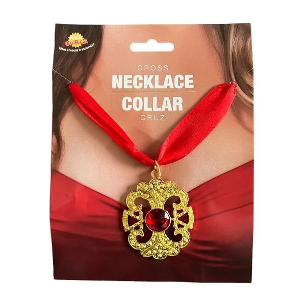 Pokud chcete na Halloween party vypadat opravdu jako ten nejbohatší upíří hrabě, tento zlatý medailon na červené stuze váš kostým skvěle doladí.